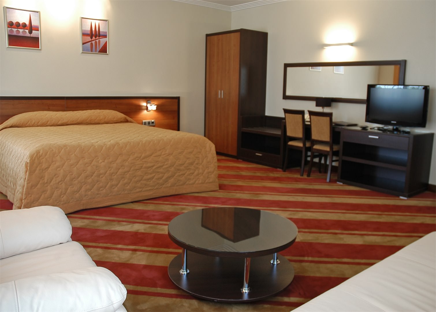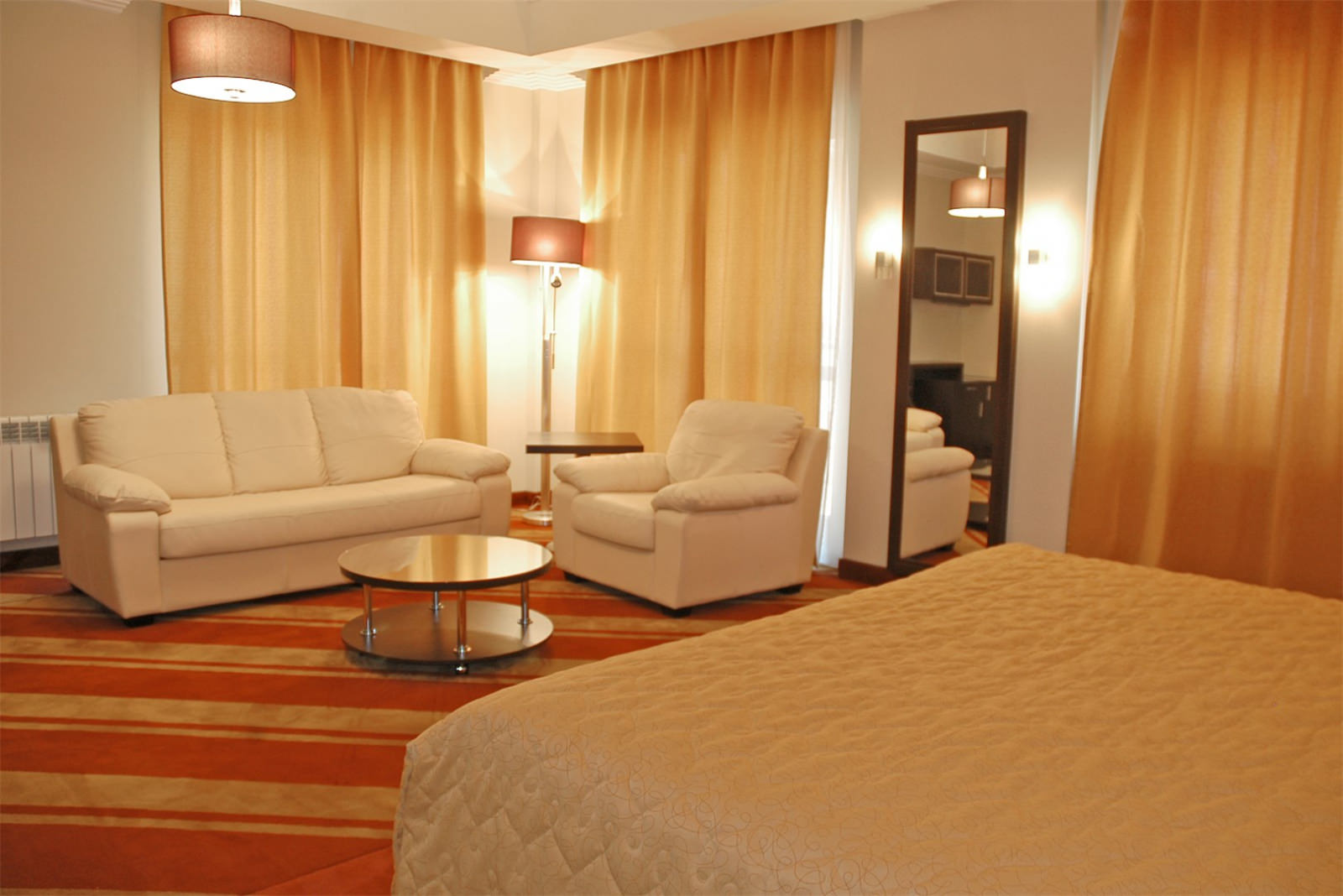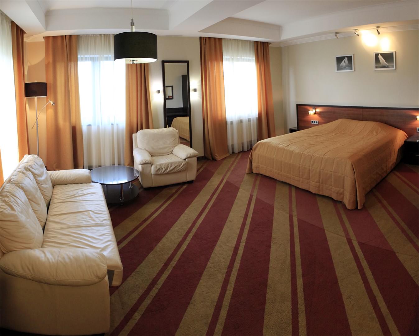 Площадь номера - 54 кв.м. 2 осн. места. 1 доп. место. Мебель: вешалка, диван раскладной, зеркало, кресла, кровать двуспальная, прикроватные тумбочки, стол, столик кофейный, стулья, тумба багажная, шкаф. Оборудование: кондиционер, набор посуды, сейф, телевизор ЖК, холодильник, электрочайник. Санузел: 2 санузла, с ванной, туалетные принадлежности, фен. Сервис: Wi-Fi бесплатно, room-сервис, мини-бар, смена полотенец, смена постельного белья, уборка номера, услуги телефонной связи по территории отеля.