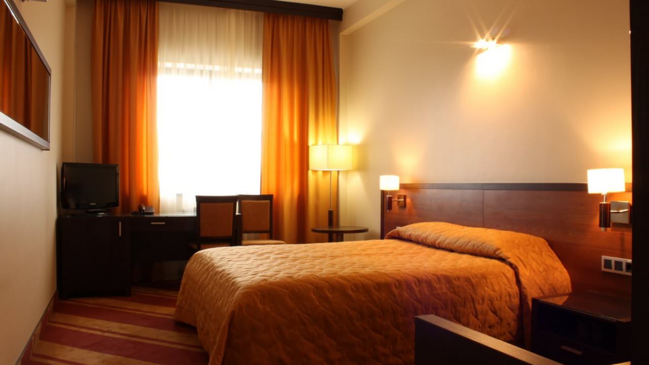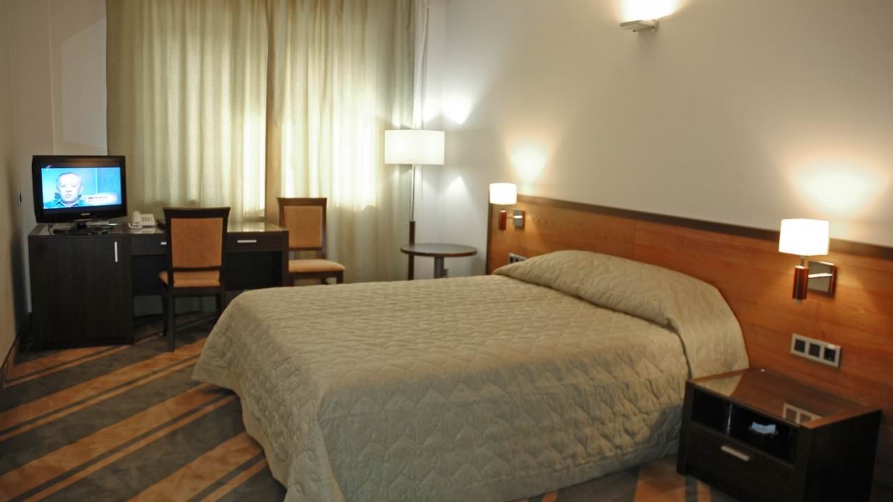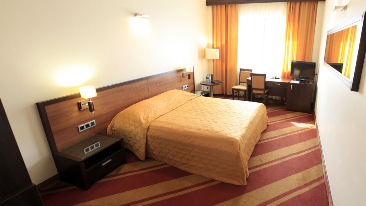 Площадь номера - 26 кв.м. 2 осн. места. 1 доп. место. Мебель: вешалка, еврораскладушка, зеркало, кровать двуспальная, прикроватные тумбочки, стол, стулья, тумба багажная, шкаф. Оборудование: кондиционер, мини-холодильник, набор посуды, сейф, телевизор ЖК, электрочайник. Санузел: с ванной, туалетные принадлежности, фен. Сервис: Wi-Fi бесплатно, room-сервис, смена полотенец, смена постельного белья, уборка номера, услуги телефонной связи по территории отеля.