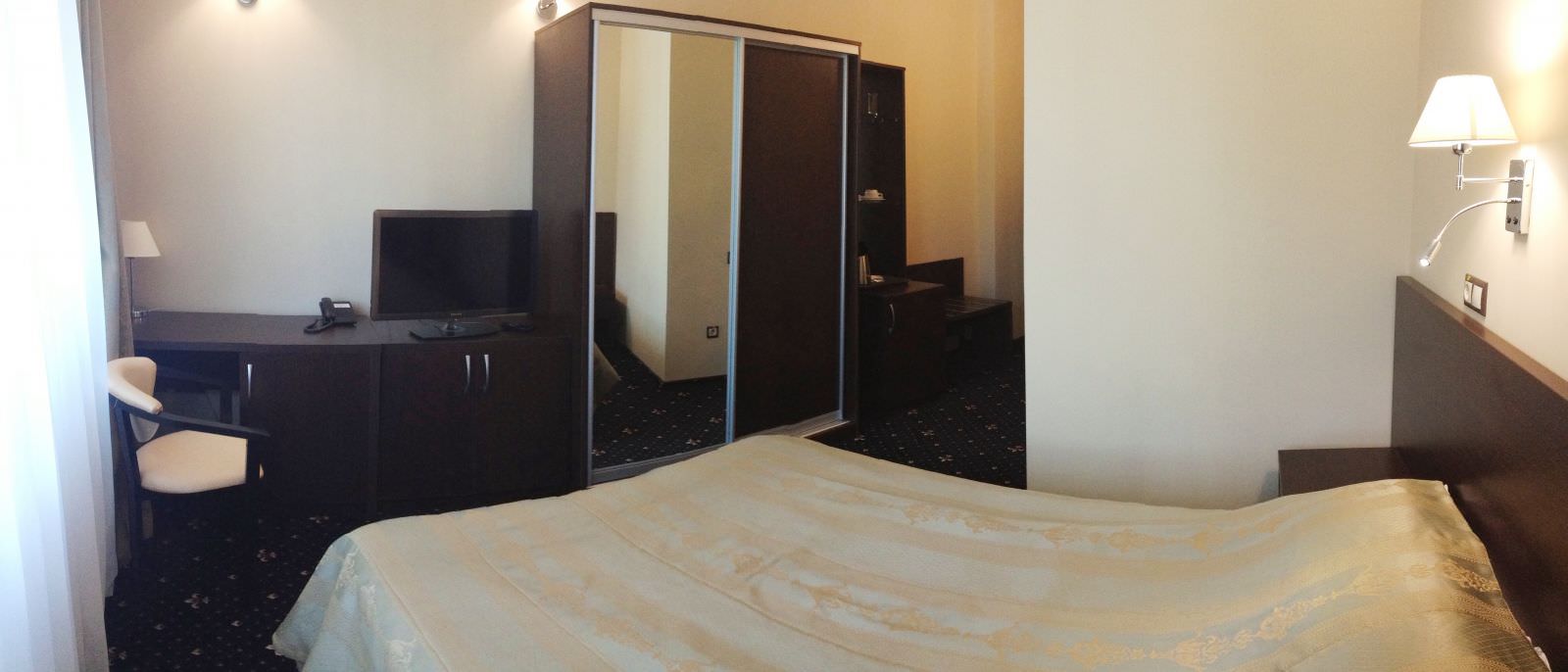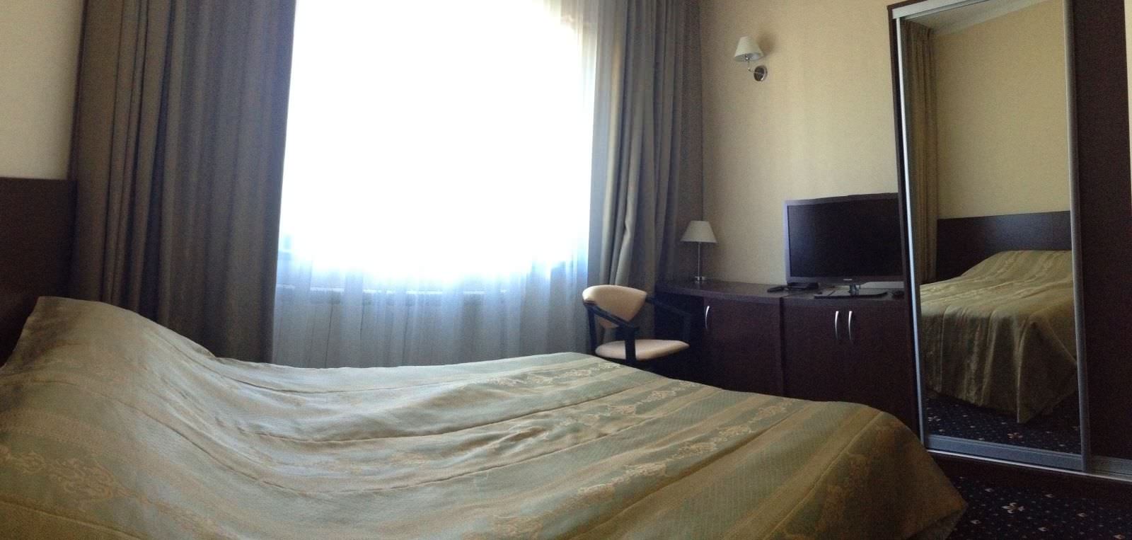 Площадь номера - 16 кв.м. 1 осн. место. Мебель: вешалка, зеркало, кровать полутороспальная, прикроватные тумбочки, стол, стулья, тумба багажная, шкаф. Оборудование: мини-холодильник, набор посуды, сейф, система общего кондиционирования, телевизор ЖК, электрочайник. Санузел: с душем, туалетные принадлежности, фен. Сервис: Wi-Fi бесплатно, room-сервис, смена полотенец, смена постельного белья, уборка номера, услуги телефонной связи по территории отеля.