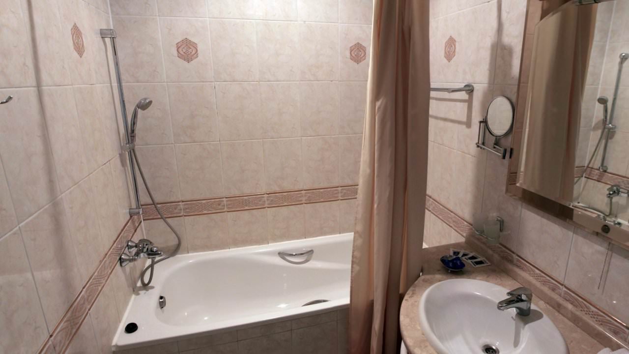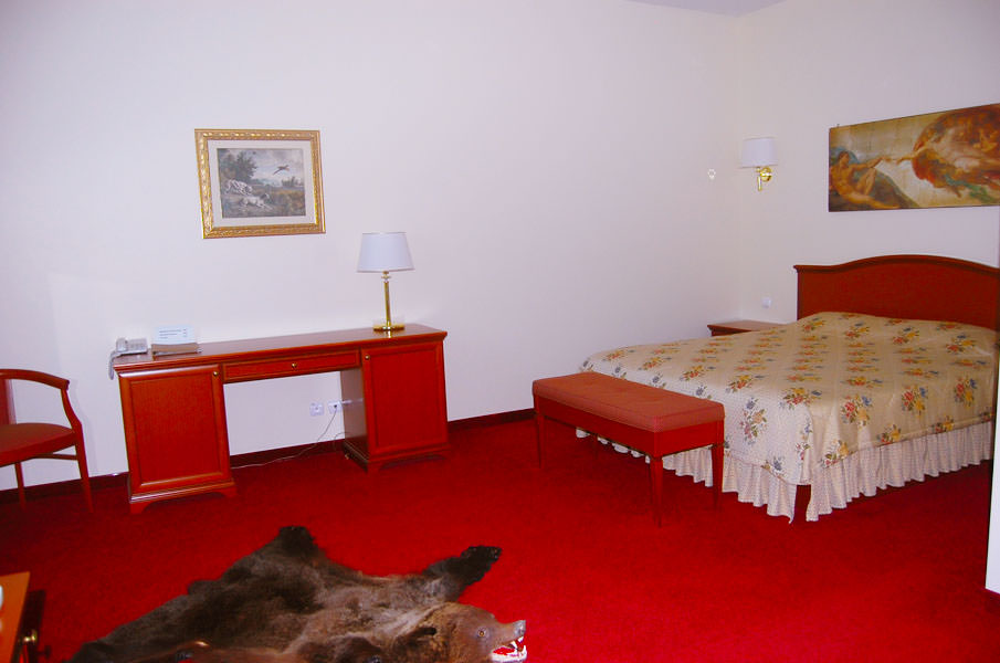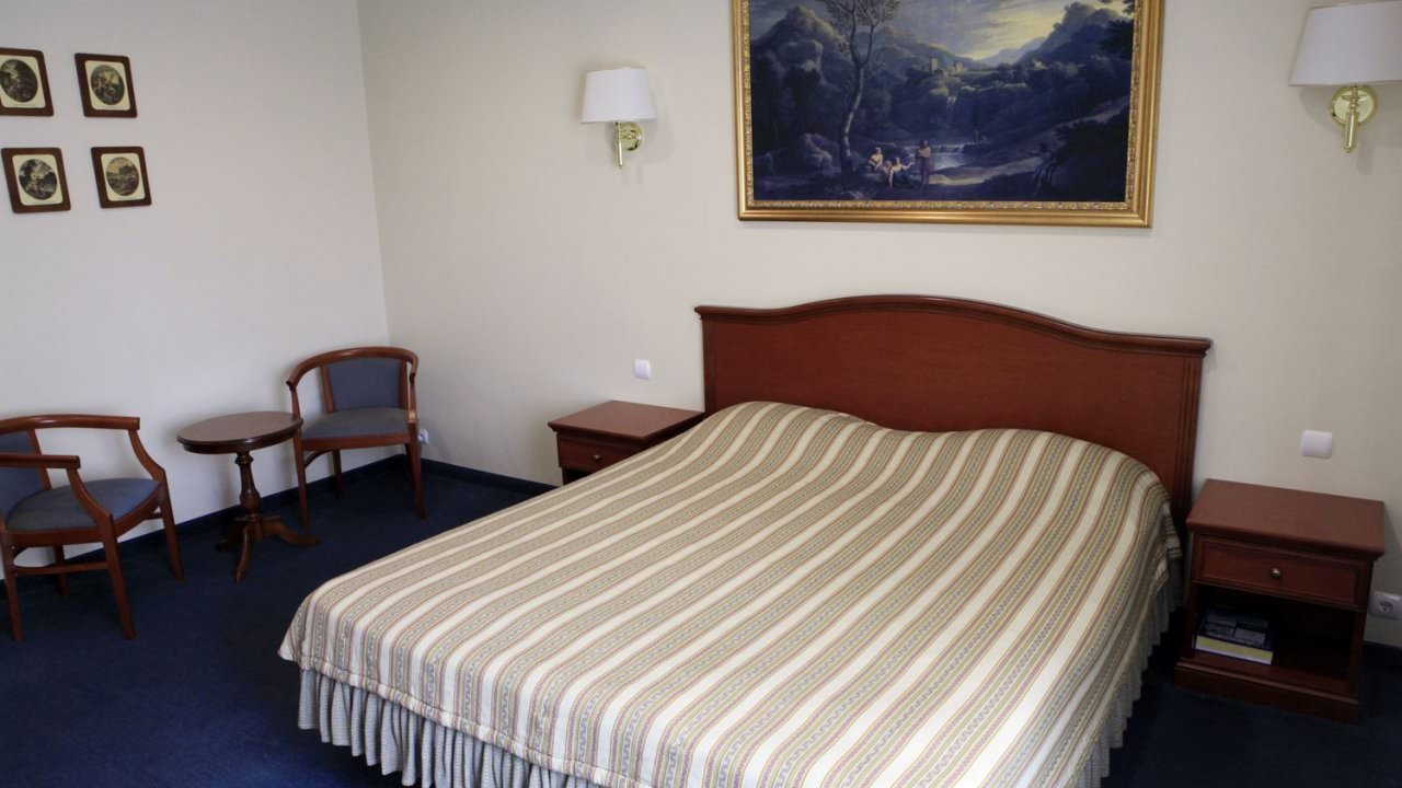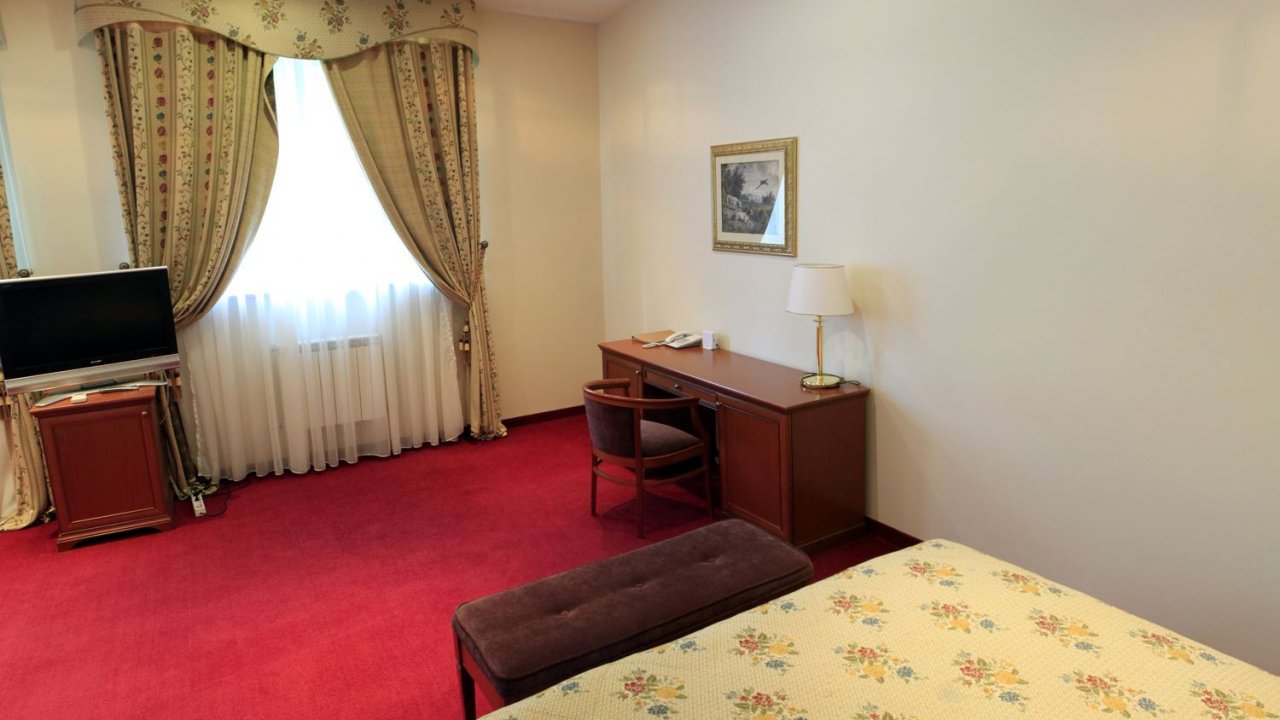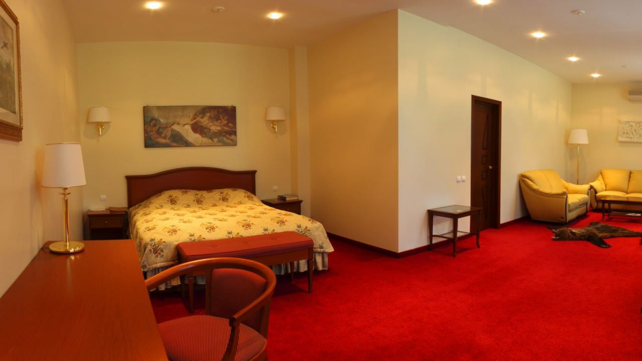 Площадь номера - 35 кв.м. 2 осн. места. 2 доп. места. Мебель: диван раскладной, зеркало, кресла, кровать двуспальная, прикроватные тумбочки, стол, стулья, тумба багажная, шкаф. Оборудование: кондиционер, мини-холодильник, набор посуды, сейф, телевизор, электрочайник. Санузел: с ванной, туалетные принадлежности, фен. Сервис: Wi-Fi бесплатно, room-сервис, смена полотенец, смена постельного белья, уборка номера, услуги телефонной связи по территории отеля.